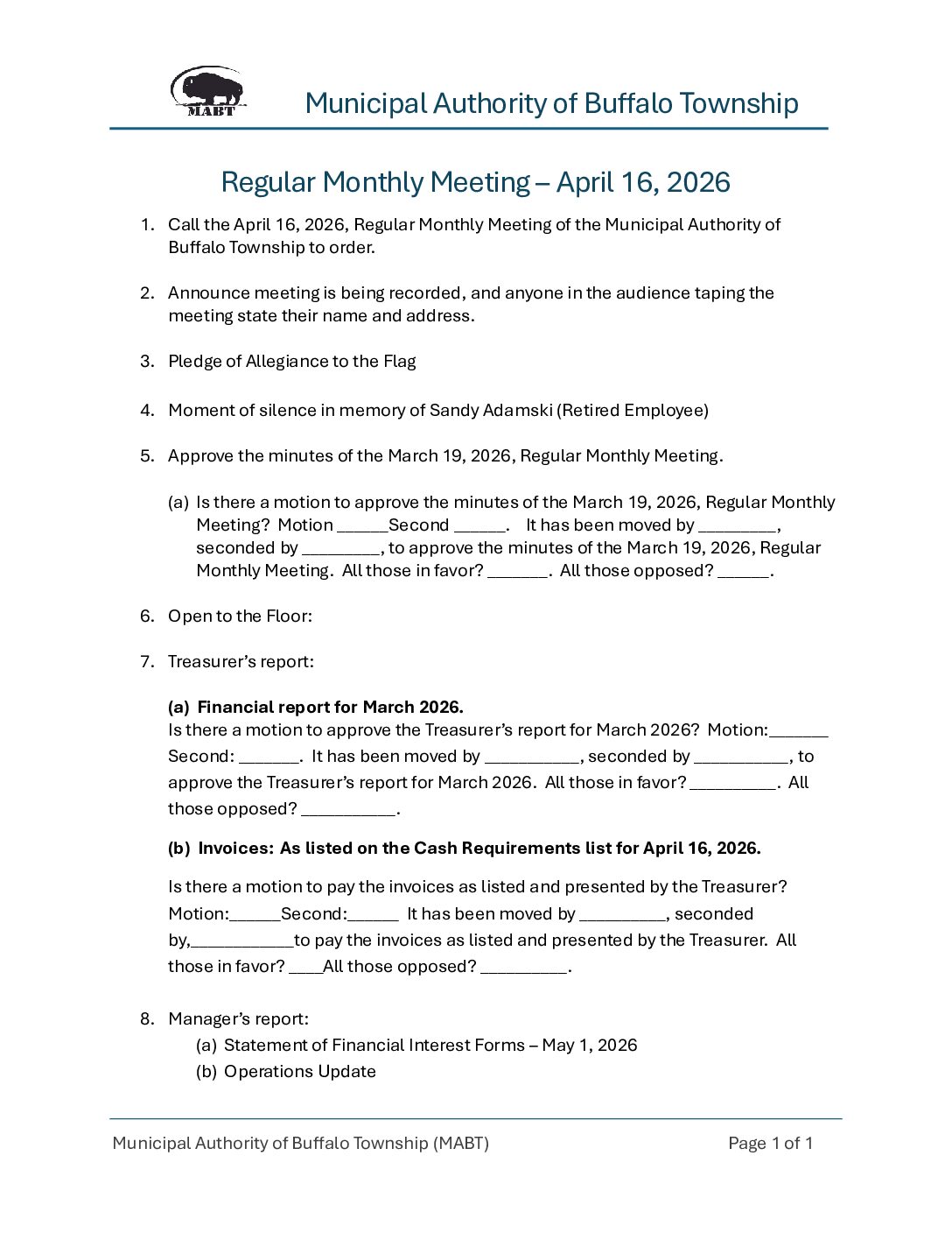 The Municipal Authority of Buffalo Township is governed by a five-member board. The members of this board are appointed to 5-year terms by the Buffalo Township Supervisors.